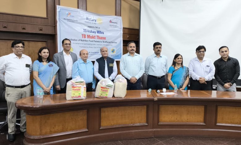 रोटरीच्या डिस्ट्रक्ट ३१४२ च्या माध्यमातून पहिल्या टप्प्यात १७५ कुटुंबाना नि क्षय आहाराचे वाटप करण्यात आले. पालिकेच्या नरेंद्र बल्लाळ सभागृहात झालेल्या या कार्यक्रमास पालिकेतर्फे अतिरीक्त आयुक्त प्रशांत रोडे, पालिका उपायुक्त उमेश बिरारी, मुख्य वैद्यकीय अधिकारी डॉ. चेतना नितील के , क्षयरोग विभागाचे प्रमुख डॉ. प्रसाद पाटील, रोटरी इंटरनॅशनलचे माजी संचालक अशोक महाजन, रोटरी डिस्ट्रीक्ट ३१४२ चे गर्व्हनर दिनेश मेहता, सचिन भोले, अध्यक्ष रोटरी प्रेसीडन्ट क्लब डॉ. सोनल बांगडे, विविध रोटरी क्लबचे अध्यक्ष व सभासद उपस्थित होते. रोटरी गर्व्हनर दिनेश मेहता यानी याप्रसंगी सांगितले की, जुलै महिन्यात रोटरीची नवीन कार्यकारीणी स्थापन होऊन नवीन वर्षाला सुरूवात होते. या वर्षी विविध सामाजिक उपक्रमासोबत निक्षय मित्रसाठी १००० कुटुंबाना शिधा वाटप करण्यात येणार असून पहिला टप्पा म्हणून १७५ कुटुंबाना याचे आज वाटप करण्यात आले. ठाणे क्षयरोगमुक्त करण्यासाठी ठाणे पालिकेबरोबर रोटरीचे देखील योगदान असणार आहे. यावेळी सदर प्रकल्पासाठी सहकार्य केलेल्या रोटरी संस्था व व्यक्ती यांचा पालिकेतर्फे प्रशस्तीपत्रक देऊन गौरव करण्यात आला. सदर कार्यक्रम रोटरी क्लब ऑफ ठाणे प्रिमियम यांच्या सौजन्याने आयोजित करण्यात आला होता.